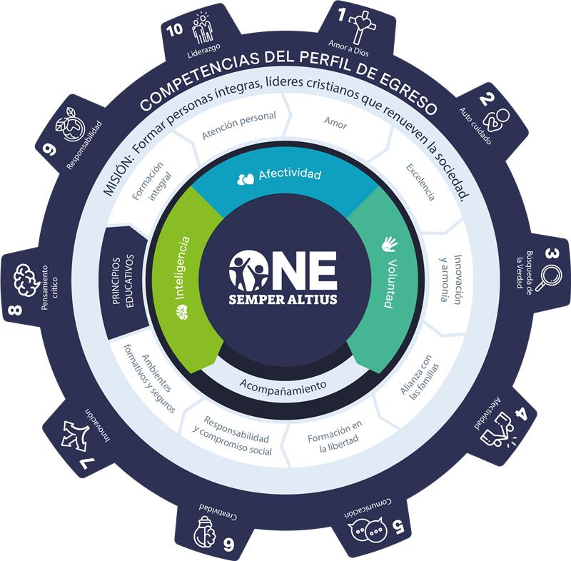 El modelo orienta su acción educativa en cuatro dimensiones fundamentales: formación humana, espiritual, intelectual y apostólica, integradas en un proceso armónico que promueve la excelencia académica, la madurez personal, la libertad responsable y el compromiso con los demás.